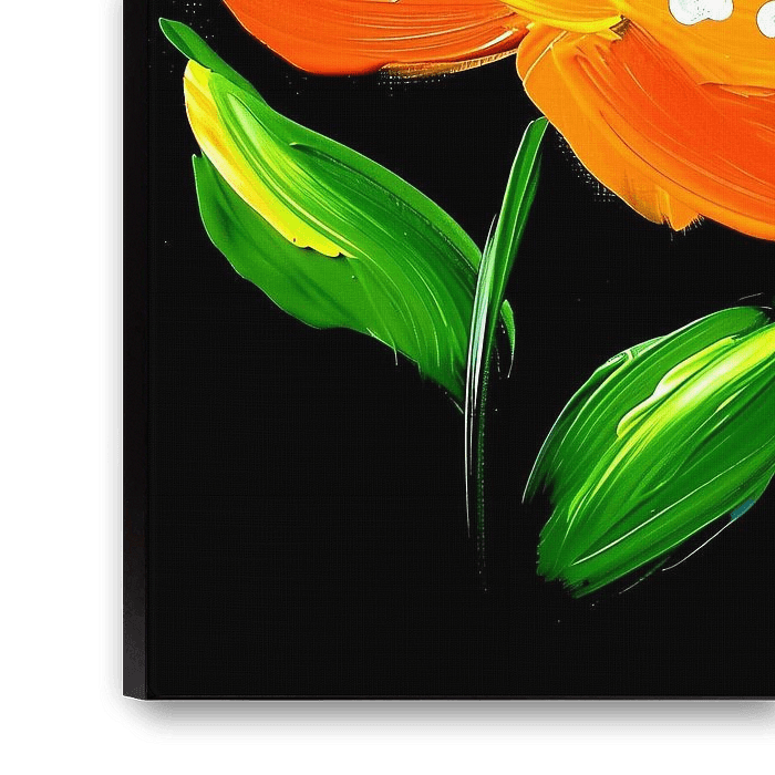 Cette peinture vibrante montre une belle fleur orange avec des feuilles vertes vibrantes sur un fond noir profond. Les couleurs contrastées rendent cette œuvre d'art parfaite pour les intérieurs modernes, ajoutant une touche de nature et de couleur à n'importe quelle pièce. Idéale pour un bureau ou une chambre, cette peinture apporte un sentiment de fraîcheur et d'énergie. Les coups de pinceau détaillés et le rendu réaliste des pétales de fleurs rendent l'expérience visuelle intrigante. Cette pièce unique n'attire pas seulement le regard, elle est aussi un sujet de conversation pour les visiteurs. Elle est idéale pour les amateurs de fleurs et d'art moderne.