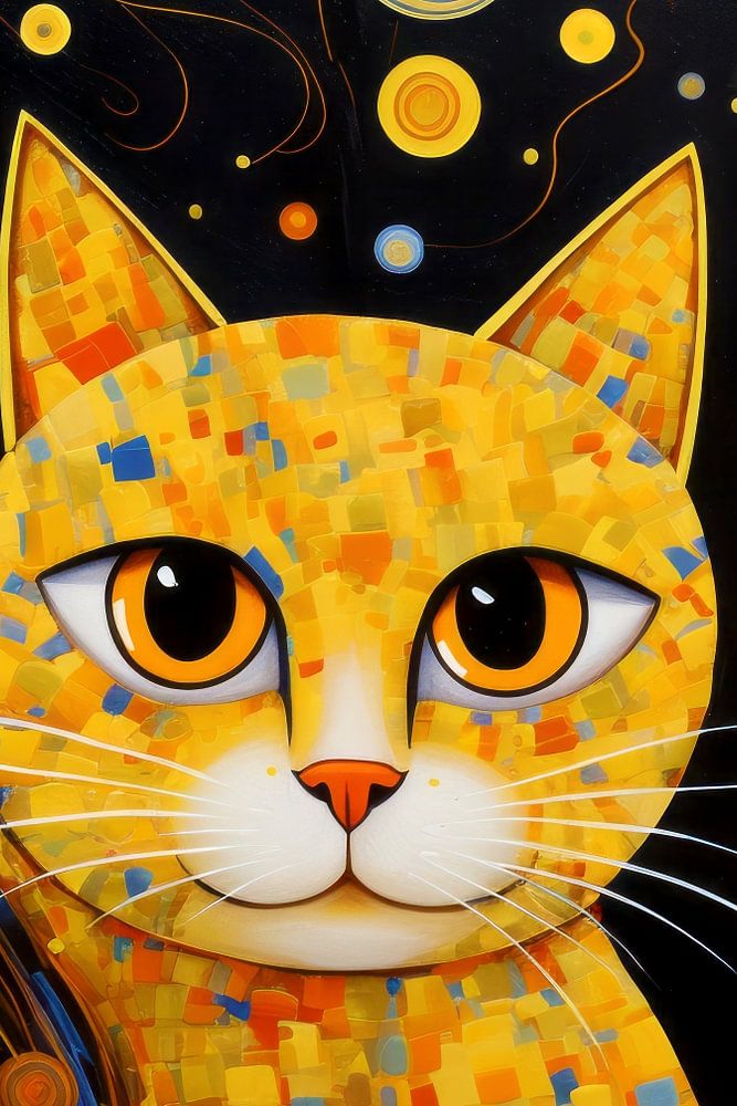 Chaque œuvre de cette collection est imprégnée de l'esthétique luxuriante du mouvement Art nouveau, caractérisée par des embellissements luxuriants, des formes organiques et des couleurs vibrantes. Les chats de ces œuvres sont représentés avec une aura de majesté et d'assurance, entourés de motifs ondulants et d'éléments décoratifs qui soulignent la profondeur de leur caractère.