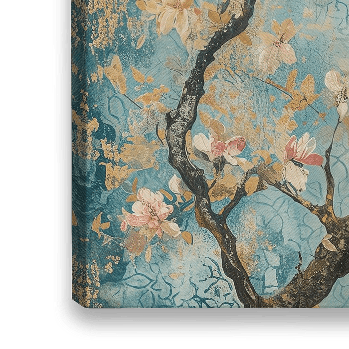 Soothing Blossom | Blossom Painting - Cette œuvre d'art apporte un second printemps à n'importe quelle pièce, dans laquelle une délicate branche de cerisiers en fleurs se déploie gracieusement sur un fond de teintes bleues apaisantes. Les subtiles nuances de rose et d'or sur le bleu créent une palette naturelle qui respire la chaleur et l'élégance. L'harmonie entre ses lignes organiques et son design texturé le rend parfait pour les intérieurs classiques et campagnards, ajoutant un élément tangible de la nature aux environnements de vie modernes.