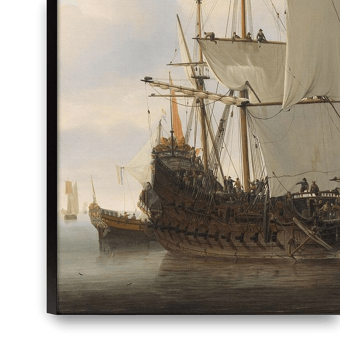 Tableau du COV : Plusieurs navires de guerre reposent sur une mer calme. Les voiles sont hissées, les ancres levées. Le petit escadron se prépare au départ. Un sloop avec des dignitaires passe devant les navires au son des trompettes et des saluts. Cette peinture a été qualifiée de tableau exceptionnel dans un catalogue de vente aux enchères dès 1778 : L'un des meilleurs chefs-d'œuvre de ce remarquable peintre de marine.