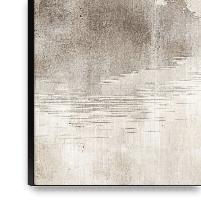 Peinture de paysage - Reflets d'une solitude tranquille - Cette peinture de paysage dépeint un environnement calme et serein où l'eau, la nature et les hommes se côtoient en silence. Nous voyons une vaste étendue d'eau interrompue en son milieu par un rameur solitaire dans une petite embarcation élancée. Le rameur, un homme déterminé et calme, semble avancer lentement sur la surface lisse comme un miroir. À l'arrière-plan, de légers contours de pins et un majestueux sommet montagneux suggèrent la présence d'un lieu naturel isolé, peut-être même vierge. Les couleurs du tableau sont discrètes ; les nuances de gris et de beige dominent, créant une atmosphère calme et presque monochrome, à la fois intemporelle et contemplative. L'utilisation de subtiles variations de texture crée une illusion de reflet à la surface de l'eau, tandis que le traitement minimaliste de la nature et du rameur contribue à un sentiment général de calme et de simplicité. Cette œuvre d'art minimaliste célèbre la beauté de la simplicité et le silence de l'isolement.