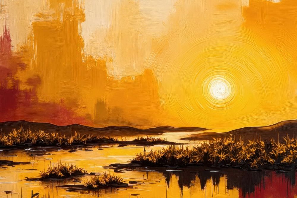 Peinture abstraite de paysage représentant un coucher de soleil, une rivière, de la végétation et un arbre en silhouette. Les tons chauds de jaune, d'orange et de rouge dominent.