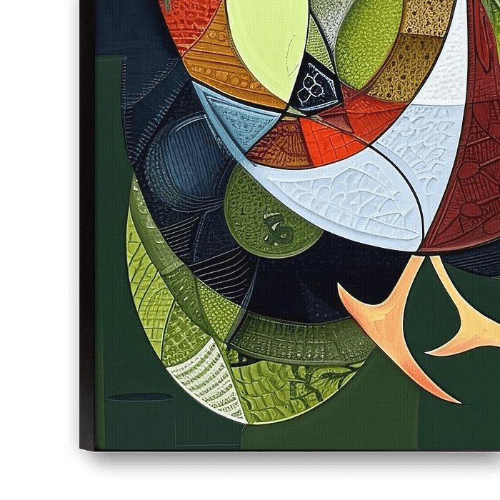 Peinture de poulet colorée - Cette peinture de poulet colorée montre deux figures stylisées et proéminentes d'un coq et d'une poule, peintes dans un style vibrant et abstrait. Chaque figure est composée de formes en patchwork remplies d'une variété de motifs tels que des lignes géométriques, des points et des lignes ondulées à l'intérieur des contours. Les becs et les pattes orange vif contrastent fortement avec le fond vert prédominant qui est plus sombre et contient une texture rappelant les motifs de grilles et de circuits imprimés. Le plumage des oiseaux présente un large éventail de couleurs, dont le rouge, le jaune, le bleu, le blanc, l'orange et diverses nuances de vert, les yeux des deux oiseaux étant rehaussés de rouge vif et de noir.