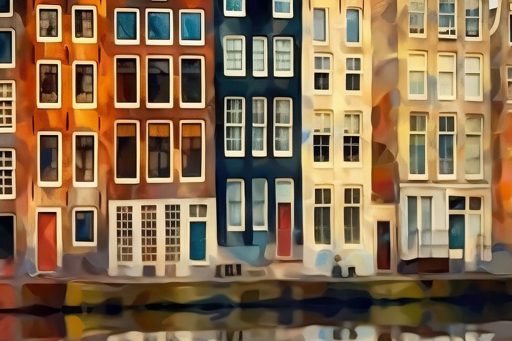 Peinture de maisons sur les canaux d'Amsterdam. Pour tous ceux qui aiment Amsterdam, les belles façades et les canaux. Une œuvre d'art pour le mur du salon ou de la chambre à coucher.