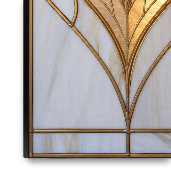 Plongez dans l'univers amoureux des années 1920 avec ce vitrail Art déco modernisé. Les éléments détaillés racontent une histoire de luxe, de prospérité et d'amour.