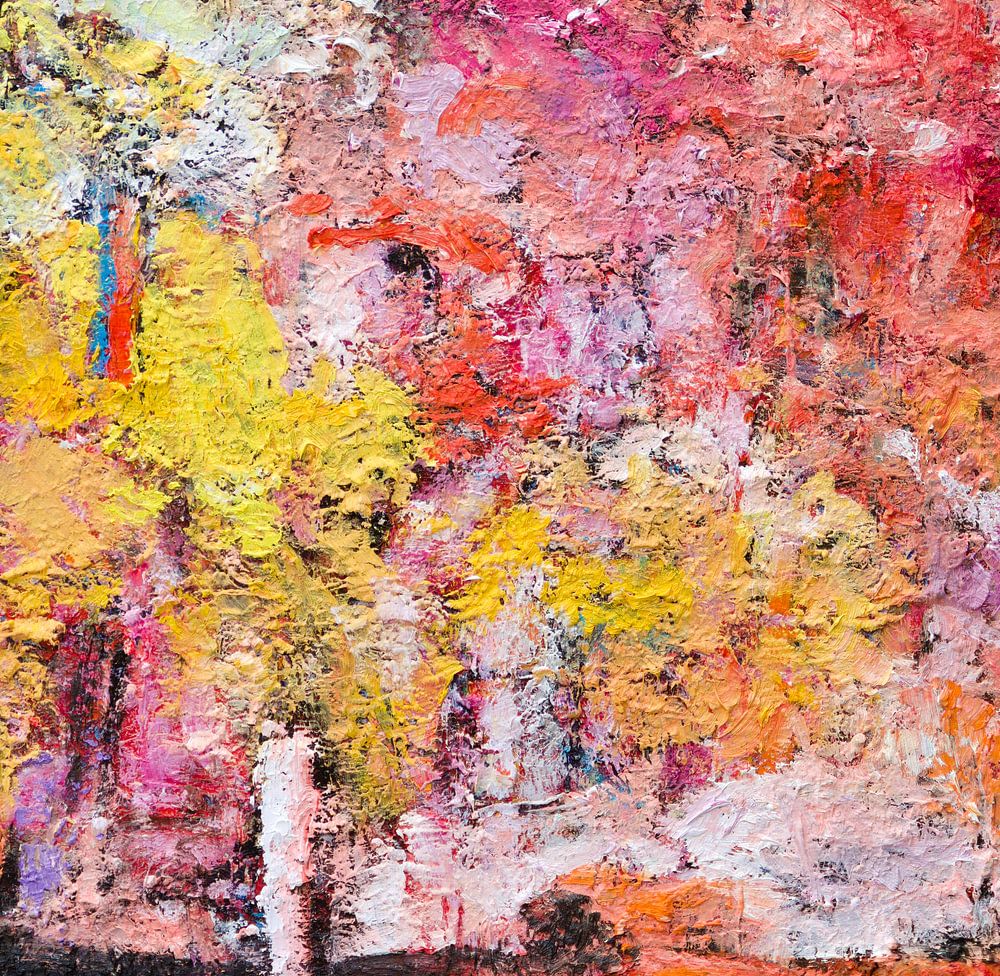 Une belle peinture abstraite aux couleurs vives : jaune, orange, rose, blanc, bleu et noir.
