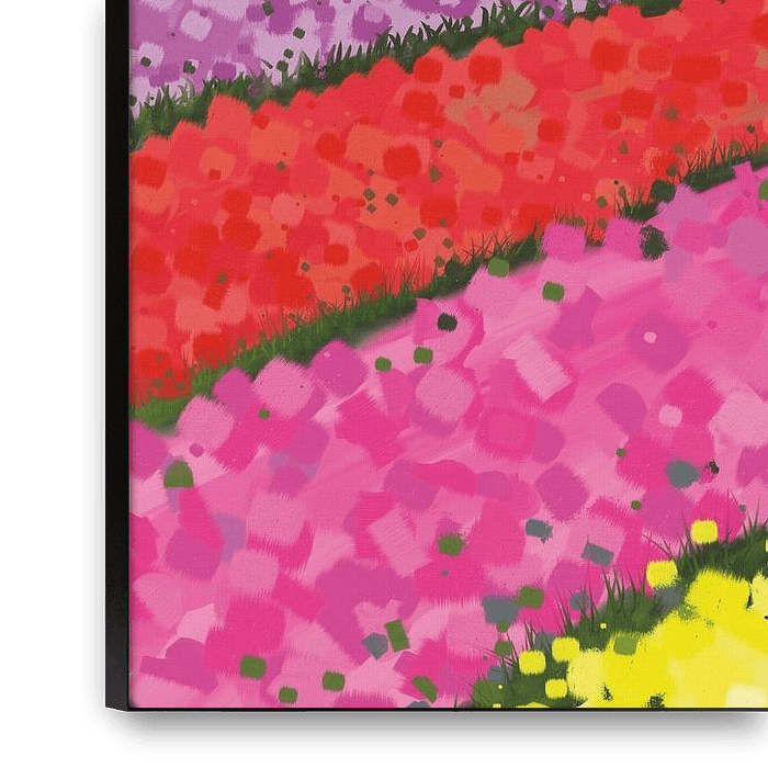 Peinture acrylique numérique d'un paysage avec des champs de tulipes hollandaises aux couleurs gaies et des arbres en arrière-plan.