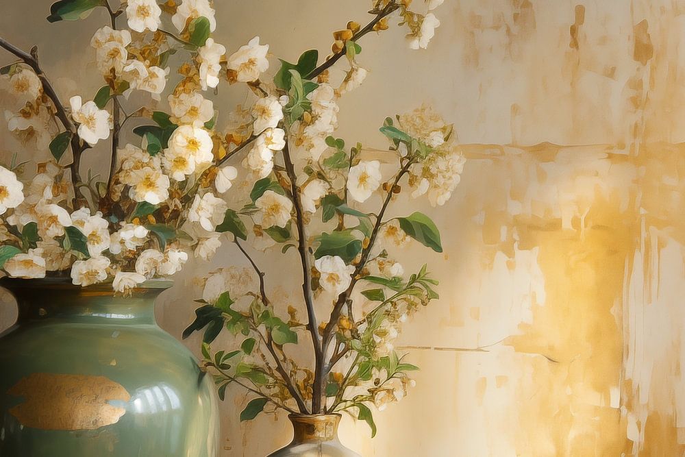 Le second petit vase doré complète la composition. L'atmosphère romantique est renforcée par les ombres ludiques qui dansent sur les vases et le bouquet de fleurs, créant une suggestion de mouvement et de vie. L'ensemble est baigné d'une lumière chaude et subtile qui fait rayonner les fleurs, symboles d'amour et de tendresse.