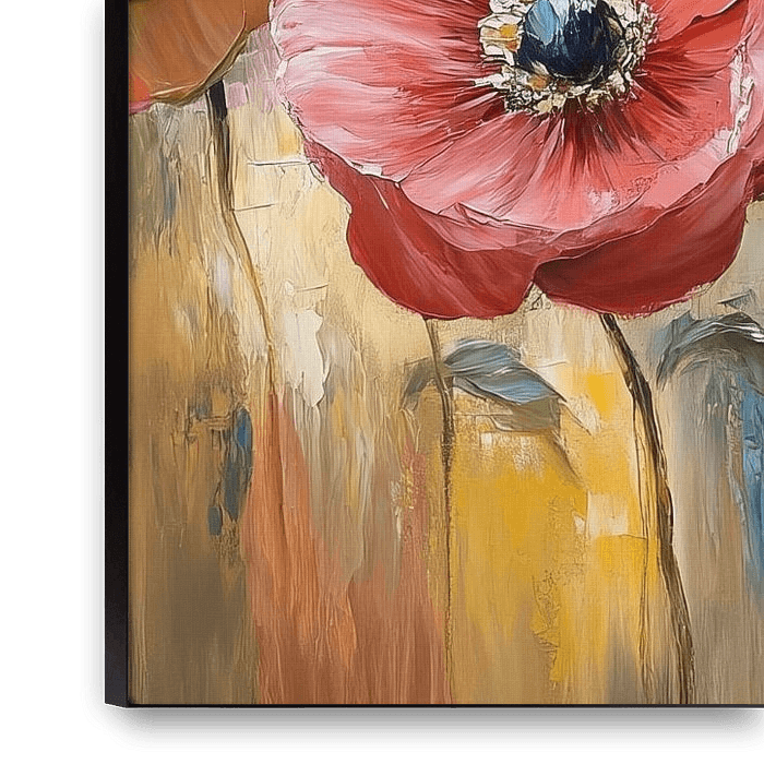Peinture de fleurs - Fleurs colorées - Il s'agit d'une peinture de fleurs montrant de grandes fleurs vibrantes de différentes couleurs telles que le bleu, le rouge, le jaune et le rose sur un fond aux teintes douces, avec une texture qui rend la peinture épaisse et tactile.