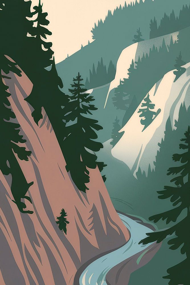 Des montagnes majestueuses encadrent une rivière qui s'écoule doucement, tandis que les douces couleurs du coucher de soleil créent une atmosphère paisible. Les formations forestières et rocheuses stylisées invitent à la détente et à la rêverie. Cette œuvre d'art est idéale pour le salon, afin d'apporter une touche de nature et de calme dans la pièce.