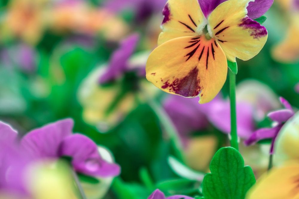 L'image montre un gros plan d'un champ luxuriant de pensées (Viola ×wittrockiana), dont les fleurs sont d'un jaune vif et d'un violet riche. Certaines fleurs réunissent les deux couleurs sur leurs feuilles, ce qui crée une image globale vivante et contrastée. L'arrière-plan est rempli de feuillage vert et d'autres fleurs, ce qui complète la couleur de la scène et lui confère de la profondeur.