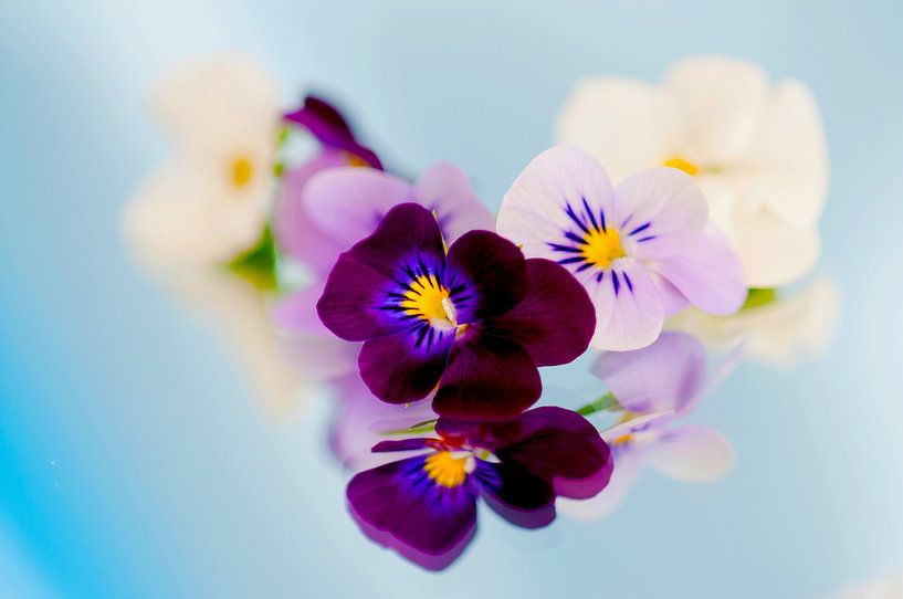 Cette photo macro de violettes violettes, blanches et lilas avec des cœurs jaunes sur un fond bleu doux pastel, capture une composition sereine et presque enchanteresse. L'image miroir des fleurs renforce l'harmonie et crée une image calme, rêveuse et poétique qui invite à l'immobilité et à l'admiration.