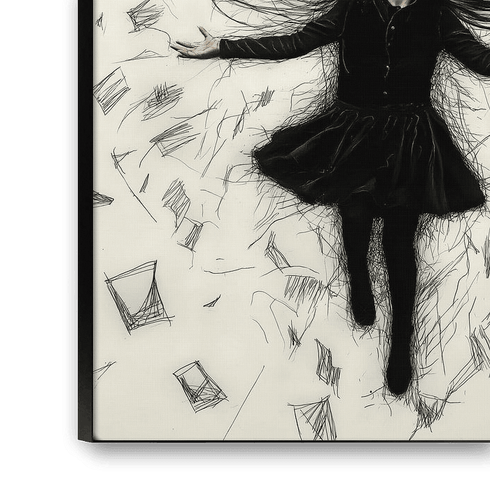 Flying Thoughts montre une femme dans une pose dynamique, les bras écartés tandis que ses longs cheveux reflètent la puissance du mouvement. La puissance de ses cheveux, qui semblent souffler dans l'air, symbolise l'abandon des pensées quotidiennes, comme si elle se libérait de tout ce qui la retient. L'image évoque un sentiment de libération, un moment où l'on s'abandonne complètement à l'univers. Les livres pliés qui flottent autour d'elle renforcent cette impression de lâcher prise - une image métaphorique des pensées et des souvenirs qui se libèrent, s'envolent et se transforment. Son regard intense, capturé par des lignes détaillées, dégage à la fois force et vulnérabilité, une combinaison intrigante qui invite le spectateur à réfléchir au moment du lâcher-prise. L'arrière-plan minimaliste met en valeur la femme et le chaos qui l'entoure, soulignant la fragilité et l'énergie du moment. Cette illustration soulève des questions sur le processus de lâcher prise et la liberté qui en découle.