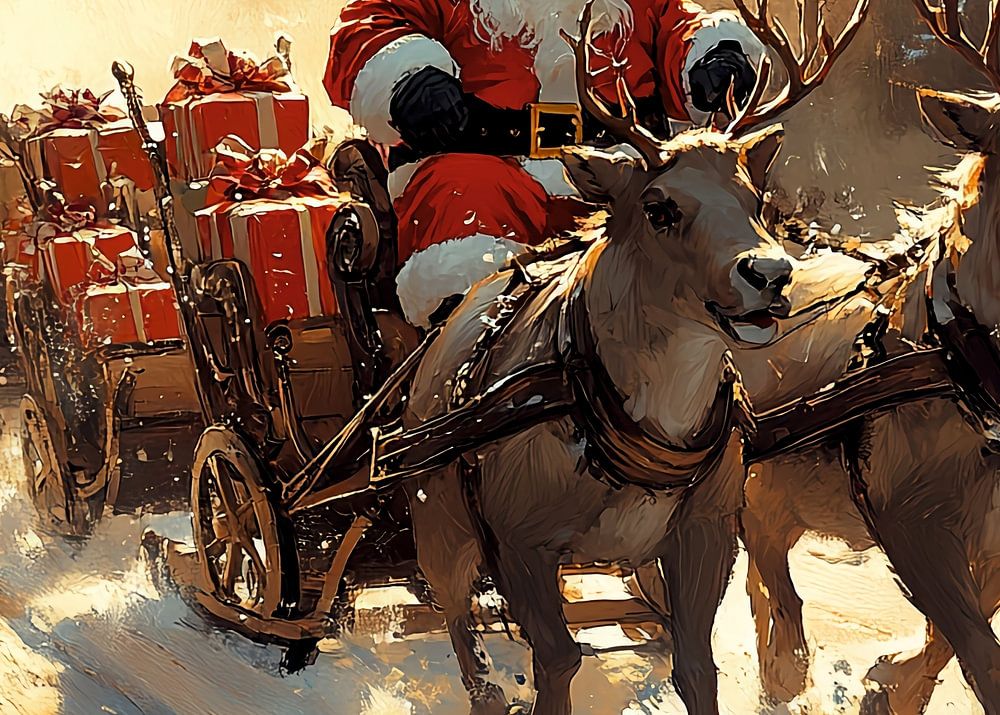 Le Père Noël sourit chaleureusement lorsqu'il livre des cadeaux la veille de Noël. Il porte un épais manteau rouge orné de fourrure blanche et un sac rempli de cadeaux sur le dos. La nuit semble magique avec la neige qui tombe doucement, tandis que le Père Noël se faufile sur le pas de la porte pour déposer des cadeaux pour les enfants qui dorment profondément, prêts à répandre le bonheur au matin. La teinte lumineuse de son visage évoque un esprit de Noël plein de magie et de bonté.