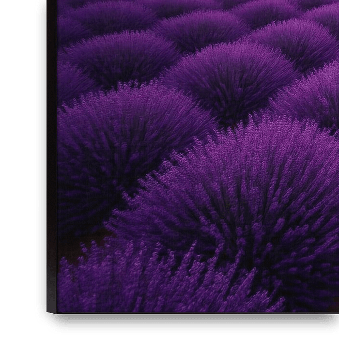 De longues rangées de lavande s'étendent à perte de vue, tandis qu'un ciel rougeoyant illumine le soir d'une lueur rouge et orange. La perspective rigoureuse donne de la profondeur et du mouvement, avec des formes répétitives qui guident le regard. Les tons violets froids contrastent fortement avec la lueur chaude au-dessus des champs,…