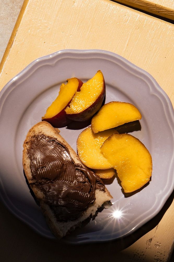 Pour les matins chauds et typiques de l'été pendant les vacances : du pain blanc avec du Nutella et des pêches.