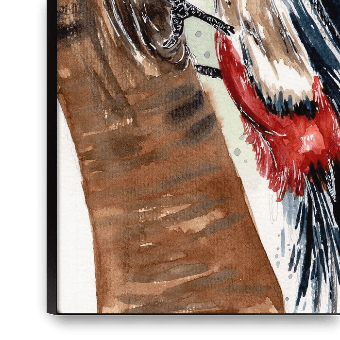 Peinture traditionnelle à l'aquarelle d'un petit pic épeiche assis sur un arbre et cherchant de la nourriture.