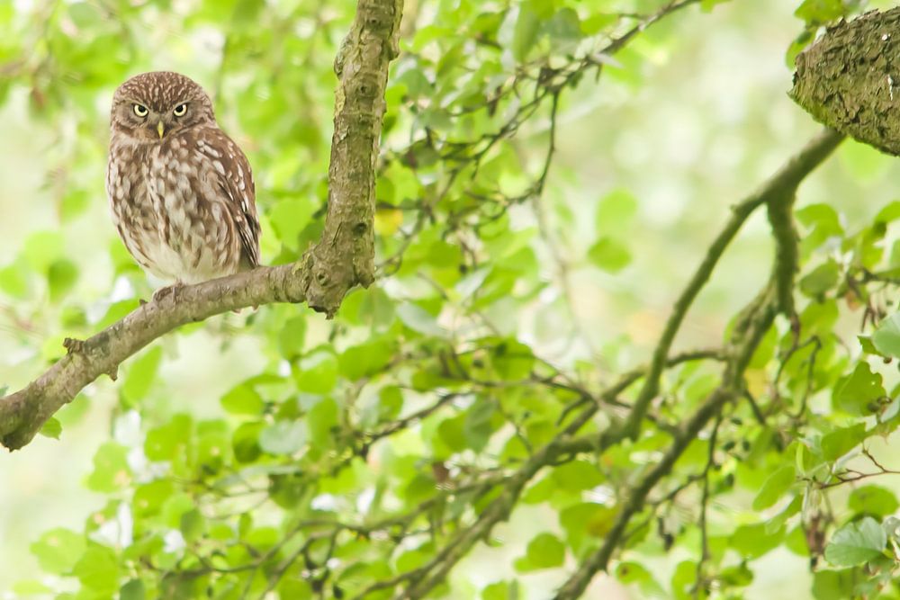 Tôt le matin, la petite chouette surveille tout de près depuis son perchoir dans l'arbre.