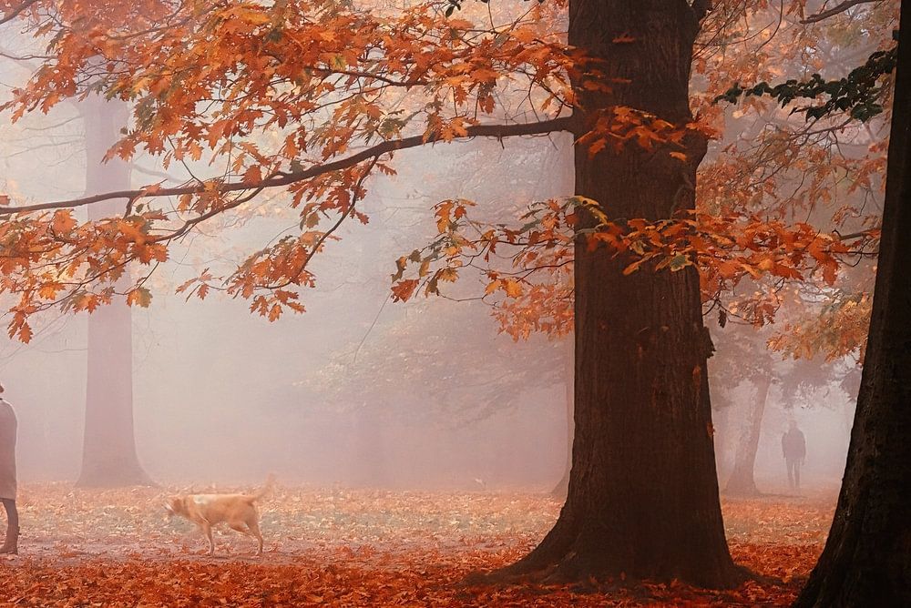 Photo d'automne mystérieuse et brumeuse avec des passants qui donnent une atmosphère mystérieuse à l'histoire.