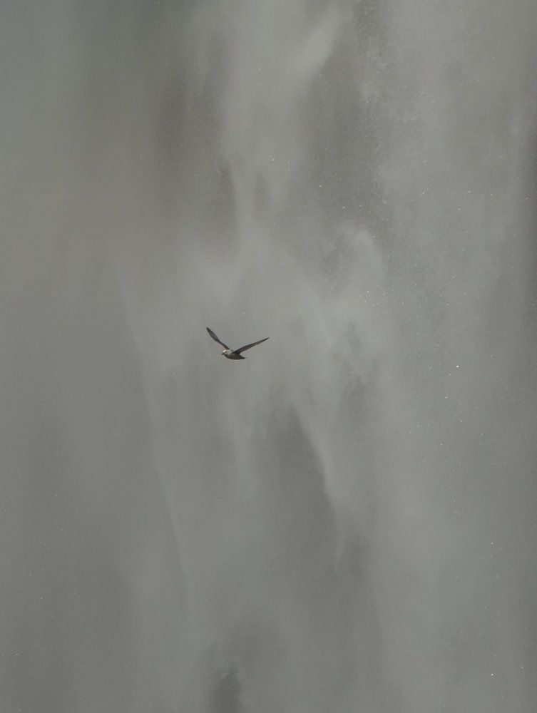 Gros plan sur une chute d'eau en Islande avec un fulmar qui passe à proximité. Une image magnifique et puissante.