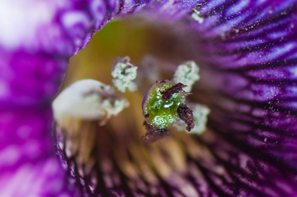 Een macrofoto van een paarse petunia. Door gebruik te maken van het scherptediepte effect worden de stampers met stuifmeel goed scherp in beeld gebracht. Het geeft een mooie dieptewerking in de foto.