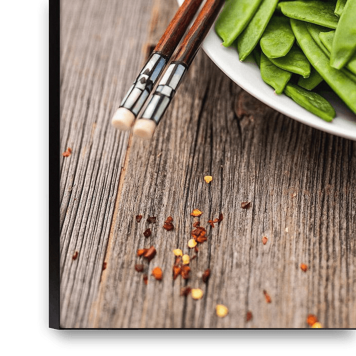 Peultjes met chopsticks op een houten ondergrond met op de achtergrond ramen.