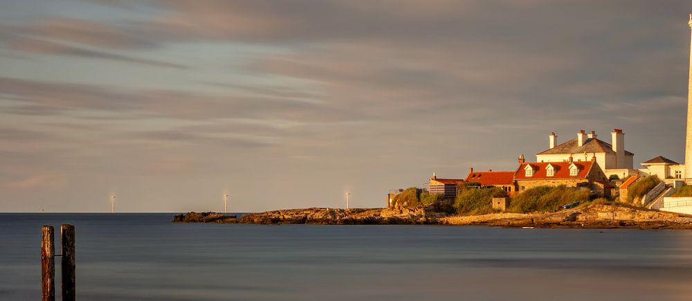 Panorama de la côte du phare St. Mary's au coucher du soleil, Grande-Bretagne