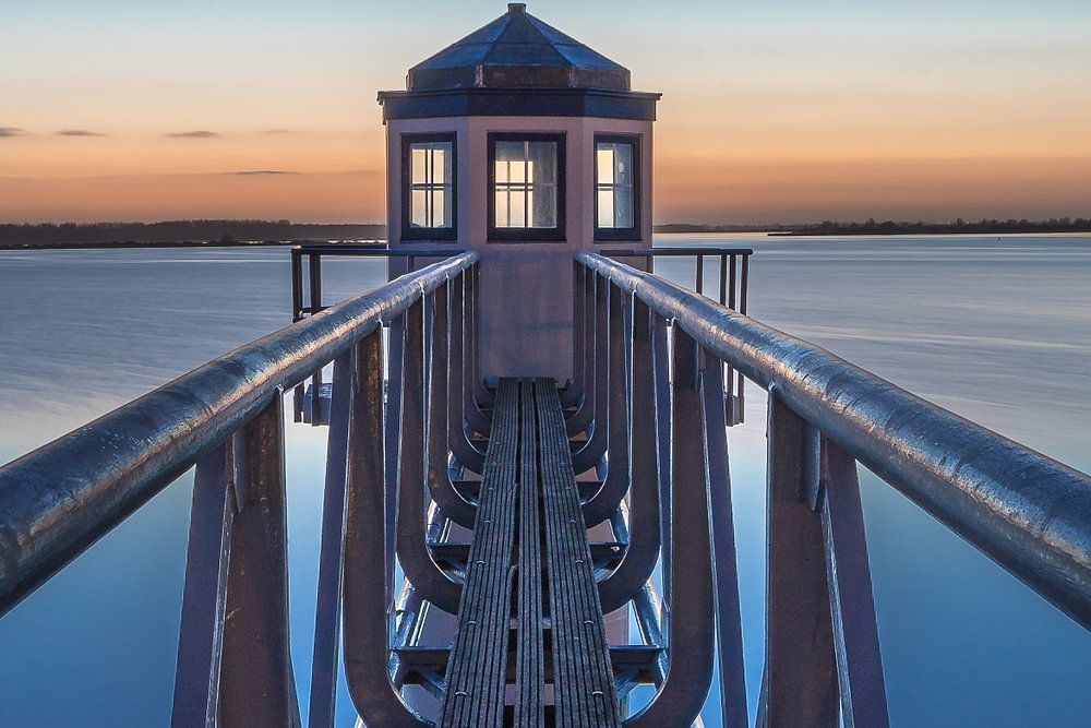 Le petit phare d'Oostmahorn dans le parc national de Lauwersmeer, au lever du soleil pendant l'heure bleue. C'était un beau matin froid de février.
