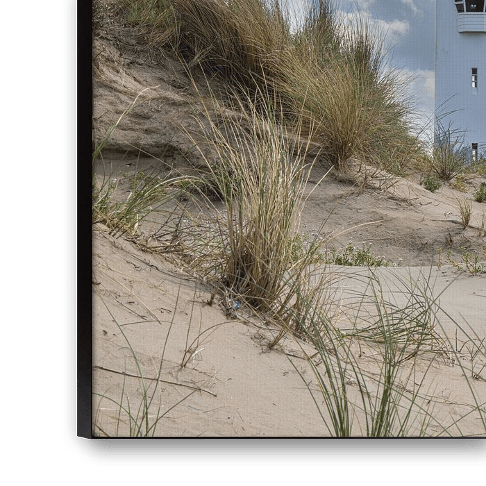 Dans l'immensité d'un ciel nuageux hollandais, le phare blanc se dresse comme une sentinelle silencieuse, claire et inébranlable. À ses pieds, l'herbe de la plage se balance doucement au gré de la brise marine. Une rangée de simples poteaux en bois marque le chemin vers la mer, modeste mais guidant, tout comme la tour elle-même. Ensemble, ils capturent l'essence du paysage côtier : force et simplicité, homme et nature, sécurité et infini.