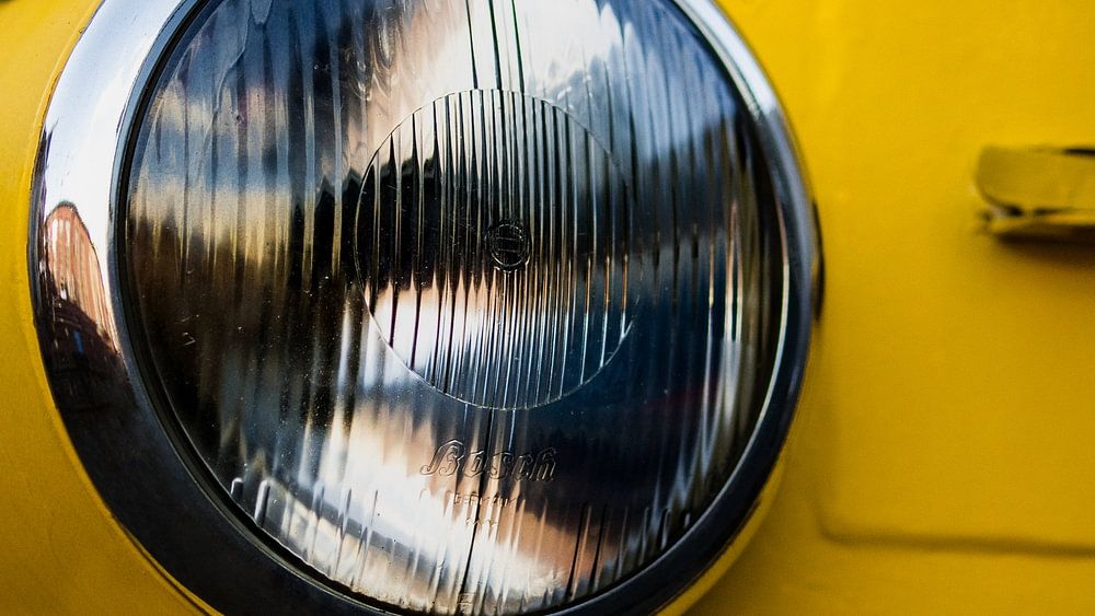 Gros plan d’un phare cerclé de chrome sur une paroi jaune de train, avec petite trappe. Graphique et moderne.