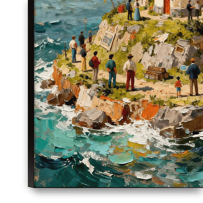 Un motif côtier plein de vie, avec au centre un phare dressé sur un petit îlot et entouré de personnages. La scène a presque un caractère narratif : des personnages se rassemblent, contemplent des œuvres d'art ou profitent simplement de la vue sur la mer. Les couleurs vives et les traces de pinceau visibles confèrent à l'image dynamisme…