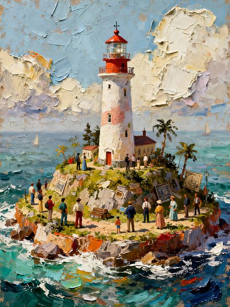 Un motif côtier plein de vie, avec au centre un phare dressé sur un petit îlot et entouré de personnages. La scène a presque un caractère narratif : des personnages se rassemblent, contemplent des œuvres d'art ou profitent simplement de la vue sur la mer. Les couleurs vives et les traces de pinceau visibles confèrent à l'image dynamisme…