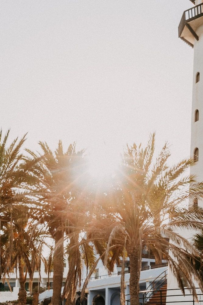 Une photo tropicale d'un phare, de palmiers et d'un coucher de soleil à Gran Canaria. Le soleil donne à la photo un bel éclat chaud. Îles Canaries
