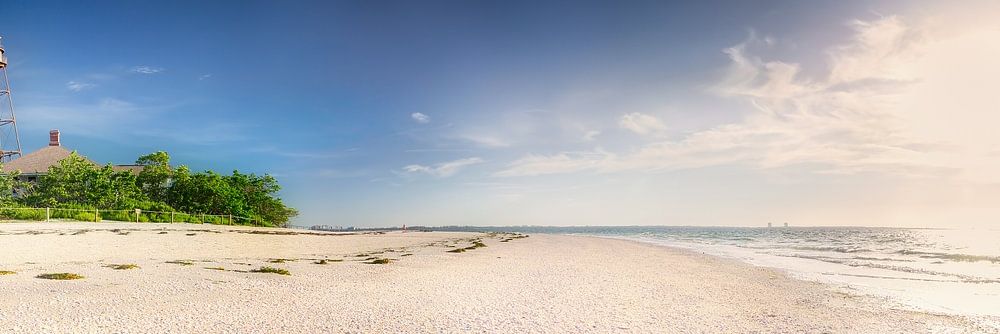 Détente totale au lever du soleil sur la plage de l'île de Sanbibel en Floride. Sanibel au matin est tout simplement magnifique. Le sable et quelques coquillages aux couleurs pastel scintillent dans la lumière chaude du soleil et la mer nous accueille dans des couleurs fraîches turquoise et bleu clair. Avec les Keys (Key West), c'est l'un des plus beaux lieux de repos et de détente de Floride. Image panoramique du paysage 310162ays