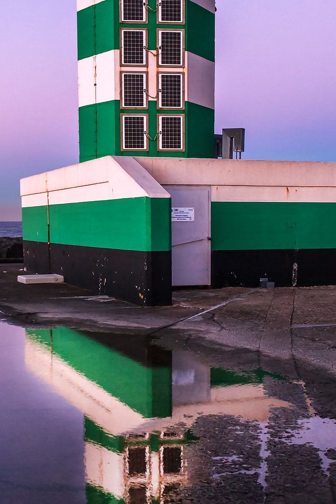 La balise verte et blanche se détache nettement sur le ciel et la mer violets. Elle symbolise à la fois un guide sûr pour les navires et un élément puissant de la nature, une balise d'espoir dans le calme de la nuit. Le ciel violet ajoute une atmosphère rêveuse et presque magique à la scène.