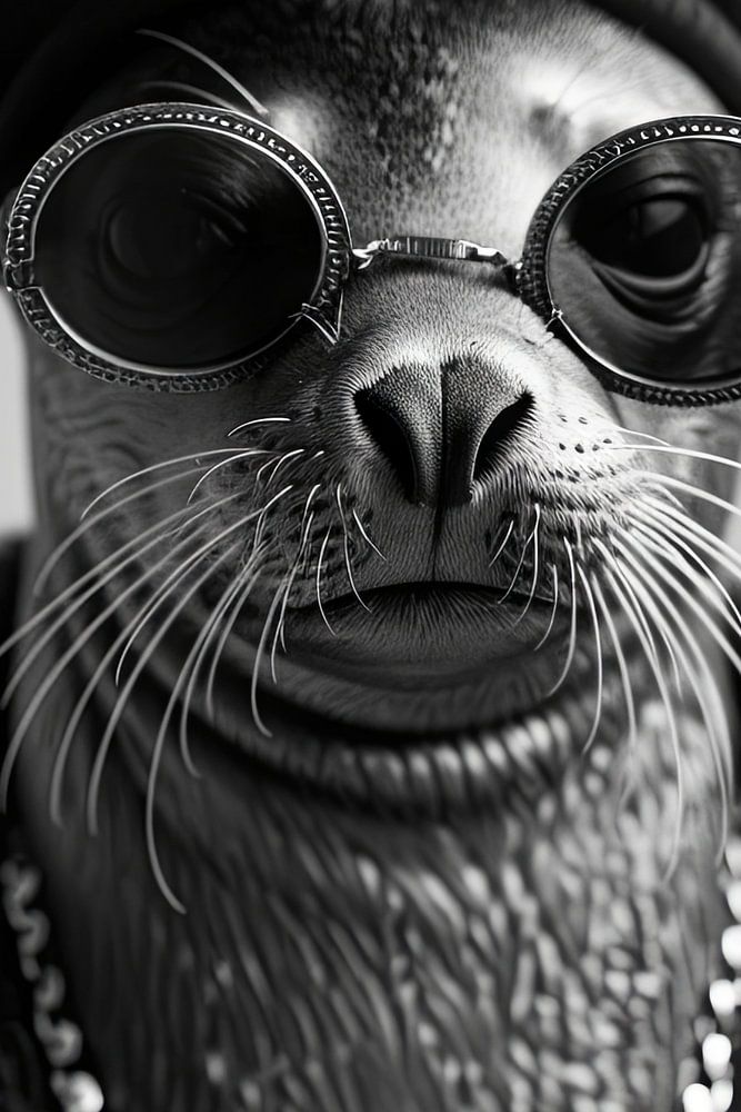 Image en noir et blanc d'un phoque dans une pose à la mode, vêtu d'un chapeau, de lunettes de soleil décorées et d'une écharpe à motif léopard.