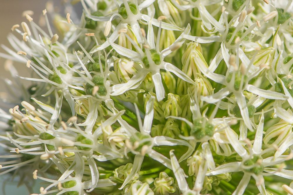 Une photo de détail d'un oignon ornemental blanc. Macrophotographie. Photographie de la nature.
