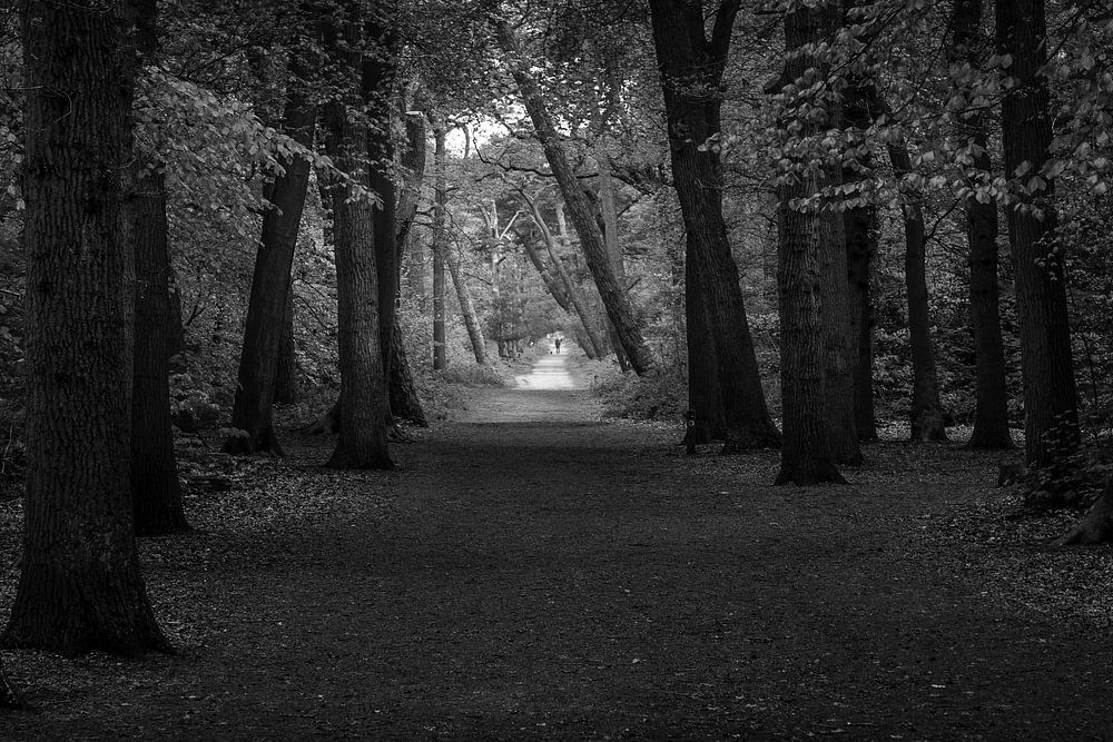 Photo en noir et blanc chemin forestier près de Bergen par Rob Baken