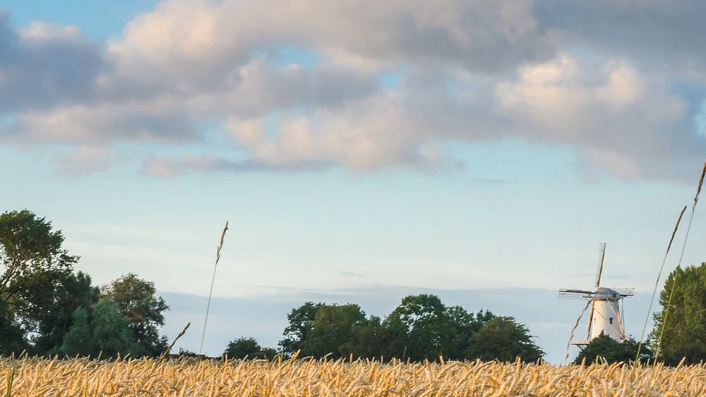 Blé mûr en floraison en zone agricole. Des champs de blé dans la chaude lueur du soleil du soir près de la ville historique de Veere. Vue sur le moulin, Zélande, Pays-Bas.