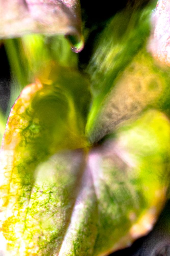 Photo macro d'une plante violette et verte avec des gouttes d'eau dessus, prise derrière une vitre. J'ai utilisé une très faible profondeur de champ, de sorte qu'une grande partie de l'image est floue, rendant l'image un peu abstraite. Cette photo fait partie d'une série.