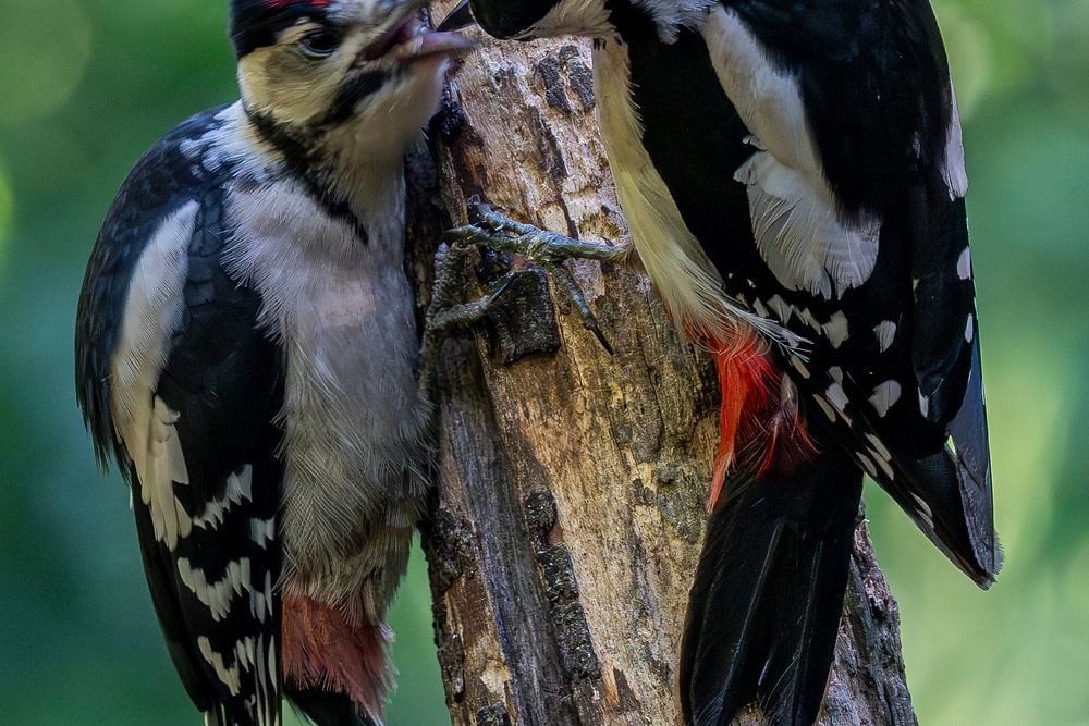 Fin juin. Les jeunes pics sont déjà presque indépendants mais sont nourris pendant un certain temps après avoir quitté le nid.