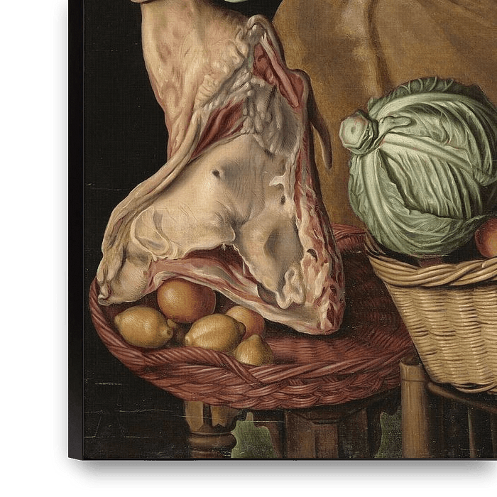 Pièce de cuisine, avec Jésus et Marthe et Marie à l'arrière-plan. Au premier plan, une femme de ménage avec un jambon et un panier de légumes. À droite, il y a plus de légumes, de fruits et de volaille. Cela comprend plusieurs cruches et une bouilloire.