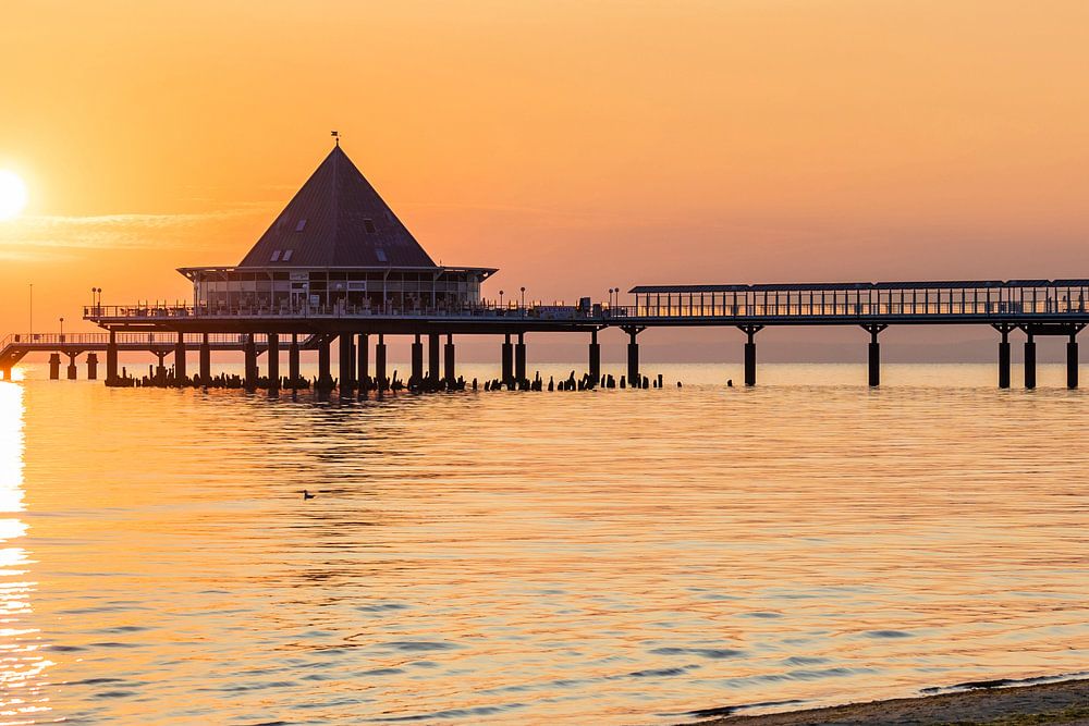 Achetez cette œuvre d'art de paysage Pier Heringsdorf au lever du soleil par Werner Dieterich sur toile, aluminium, ArtFrame ou photographie (encadrée), impression d'art en haute qualité et tout format.