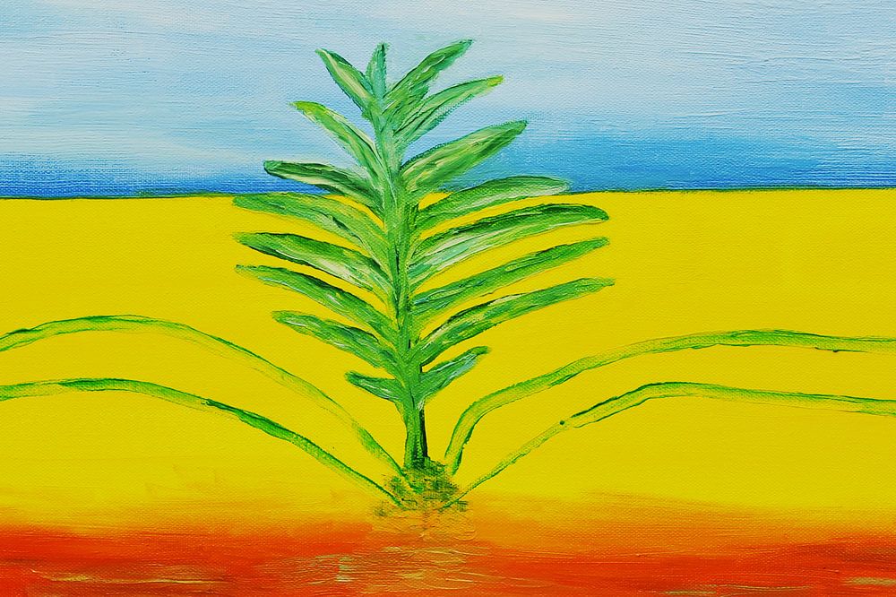 Ce tableau fait partie de la série JEUX AVEC LES ELEMENTS ET LES COULEURS DE LA VIE. Il est né de l'idée de combiner harmonieusement les éléments que sont le feu, l'eau, la terre et l'air, ainsi que les couleurs rouge, bleu, vert et jaune associées à ces éléments. Je souhaite que mes tableaux soient une source d'inspiration et qu'ils transmettent un sentiment d'énergie et de bien-être. L'élément terre est au premier plan de ce tableau.