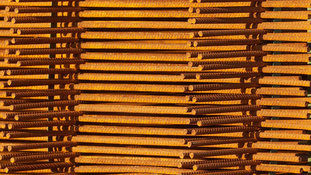 Un tas de barres d'armature rouillées sur une zone industrielle s'illumine au soleil