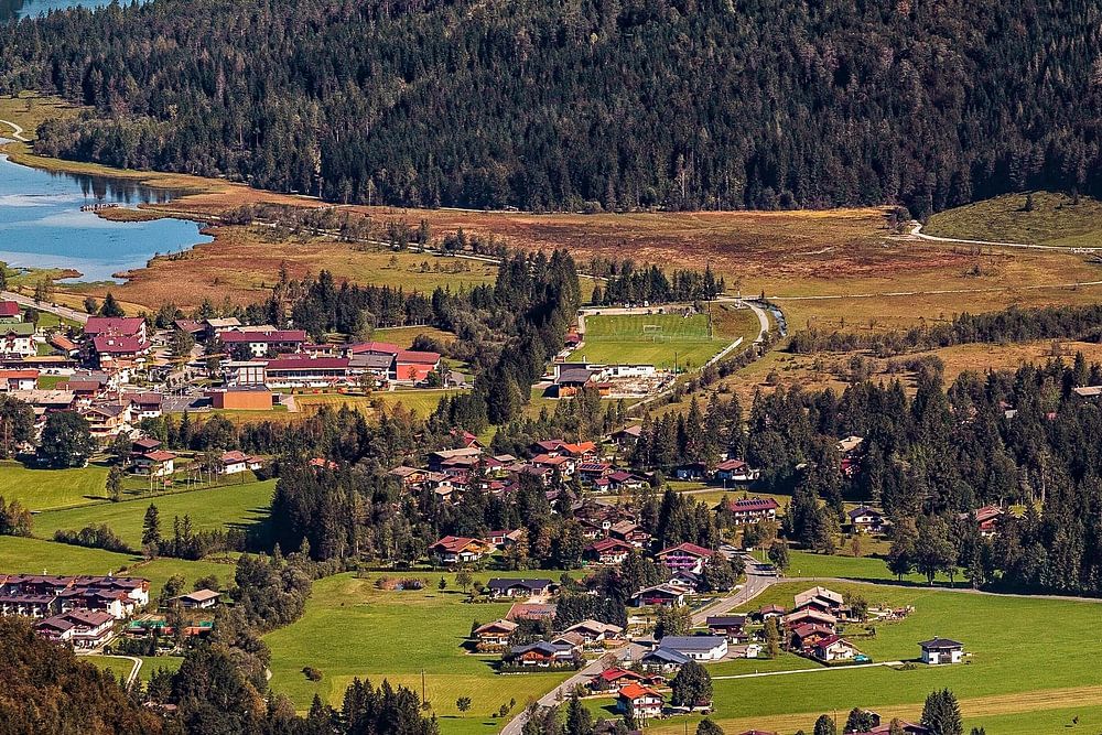 Vue sur la vallée du Pillersee depuis le Buchensteinwand dans les Alpes autrichiennes.
