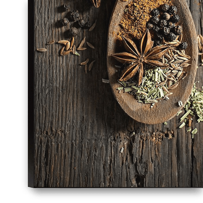Cuillère en bois avec diverses épices sur une vieille planche en bas de page.