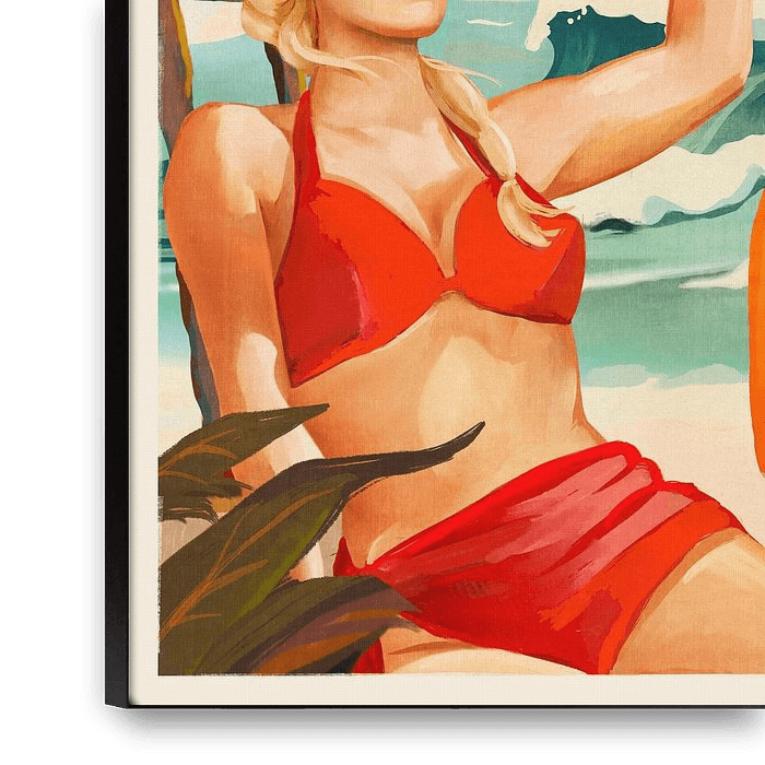 Achetez cette œuvre d'art Popart Pin-up surfeuse en bikini sur la plage par The Whiskey Ginger sur toile, aluminium, ArtFrame ou photographie (encadrée), impression d'art en haute qualité et tout format.