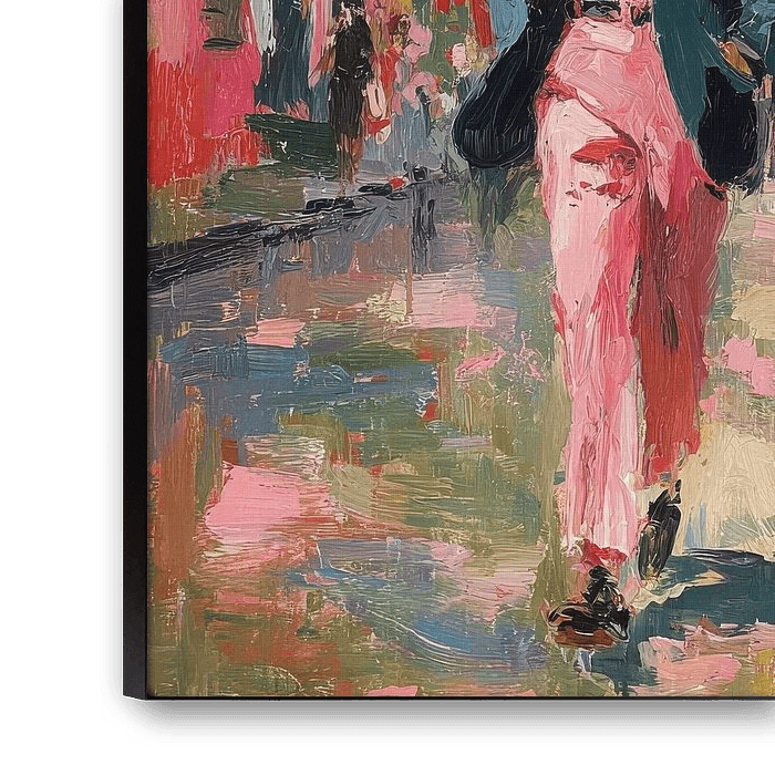Cette peinture à l'huile montre un pingouin qui se promène dans les rues de la Nouvelle-Orléans en pantalon rose, chemise blanche avec un nœud papillon noir et un blazer vert. Un chapeau de soleil est posé sur sa tête. Entourée de bâtiments et de personnes colorés, la scène évoque la vivacité et le mouvement. Des coups de pinceau impressionnistes dans le style d'Henri Matisse traduisent les couleurs et les formes de manière dynamique, avec des tons vifs et des aplats de couleurs qui soulignent l'atmosphère joyeuse. La représentation capture le caractère enjoué du pingouin, l'énergie de la ville et la composition harmonieuse des couleurs d'une journée ensoleillée et animée dans une scène charmante et colorée.