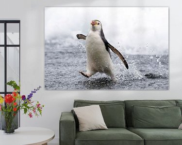 Pingouin royal (Eudyptes schlegeli) sortant de l'eau en courant. Îles Macquarie, Australie. Cette image a été utilisée dans Vogels jaargang 2018, numéro 1. Une partie des recettes de la vente de cette œuvre sera reversée à Vogelbescherming Nederland et aux organisations caritatives poursuivies par Vogelbescherming. En collaboration avec la banque d'images AGAMI.